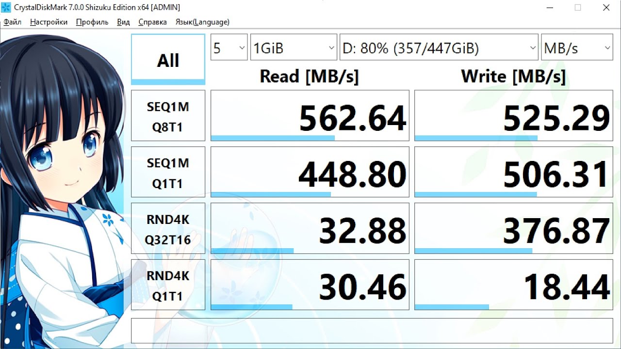 Программа позволяет быстро измерить скорость последовательного и случайного чтения или записи.Также измеряет скорость последовательного чтения или записи, измеряет скорость случайного чтения или записи 512 КБ, 4 КБ, 4 КБ (глубина очереди = 32), и выбирает тестовые данные (Random, 0Fill, 1Fill).